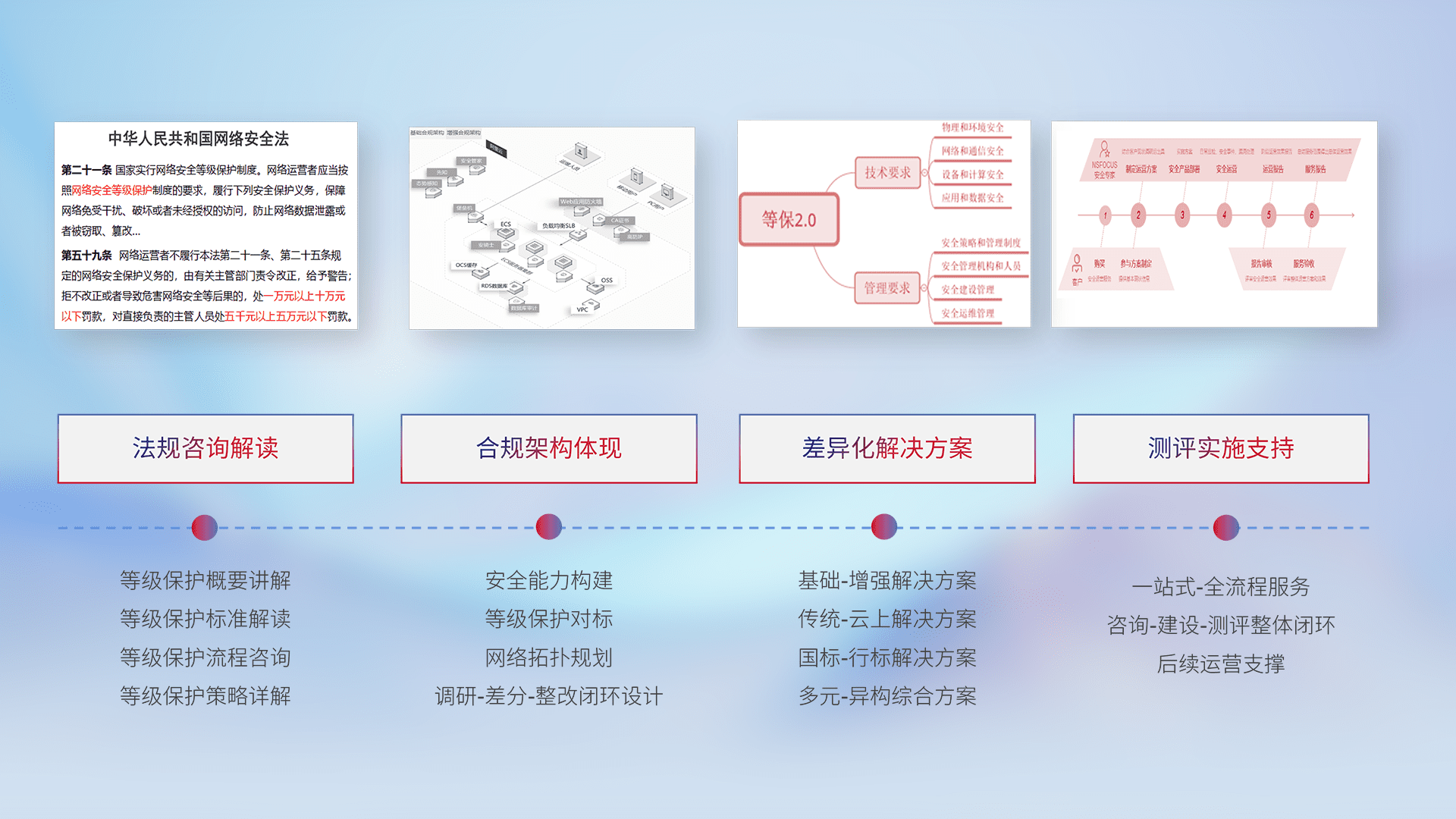 通过专业的法律咨询解读、合规架构体现、差异化解决方案、测试实施支持等服务,为客户量身打造等保合规体系。
